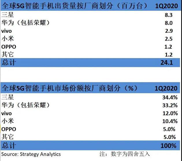 SA报告:Q1全球5G手机出货量增至2410万部 华为第二