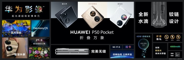 外观设计突破科技与时尚的边界,纵向折叠特性,内外双屏的加持,HarmonyOS智慧体验的运用,以及创新性的超光谱超级影像单元,让华为P50 Pocket成为一款名副其实的“宝盒”,让世界感受折叠旗舰的全新魅力。