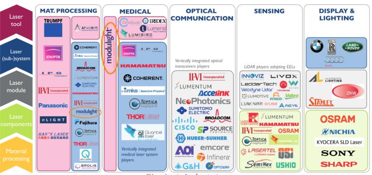 Modulight Inc. 成立于 2000 年,总部位于芬兰坦佩雷。技术源自 1970 年代以来一直在光电子研究中心和坦佩雷理工大学开展的激光和光子学研究。Modulight已在激光行业经营了20多年,建有独立完整的光电半导体晶圆线,主要市场在亚洲和美国,拥有多家财富500强公司大客户,和大型国际制药公司类客户。Modulight不仅为客户定制开发激光芯片,还为其提供医疗设备解决方案,是光动力疗法(PDT)等领域的“隐形冠军”。根据Yole Développement今年5月的报告,Modulight与IPG、II-VI、滨松等国际一流企业一起,位列工业材料加工、医疗、通信等领域的主要激光垂直整合玩家。特别是在医疗领域,Modulight更加是从半导体材料到医疗激光工具最全面垂直整合的唯一激光企业。