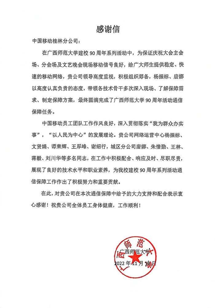 近日,桂林移动收到广西师范大学发来的感谢信,对桂林移动参与该校90周年校庆系列活动通信保障工作表示感谢。