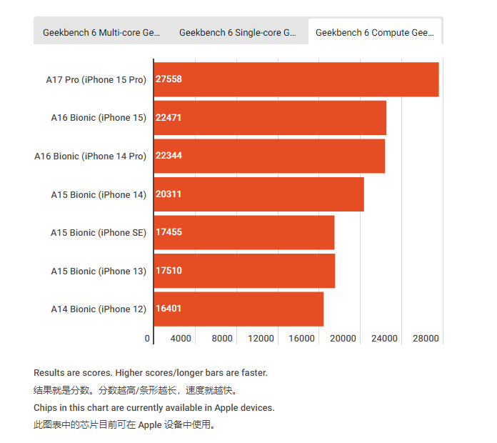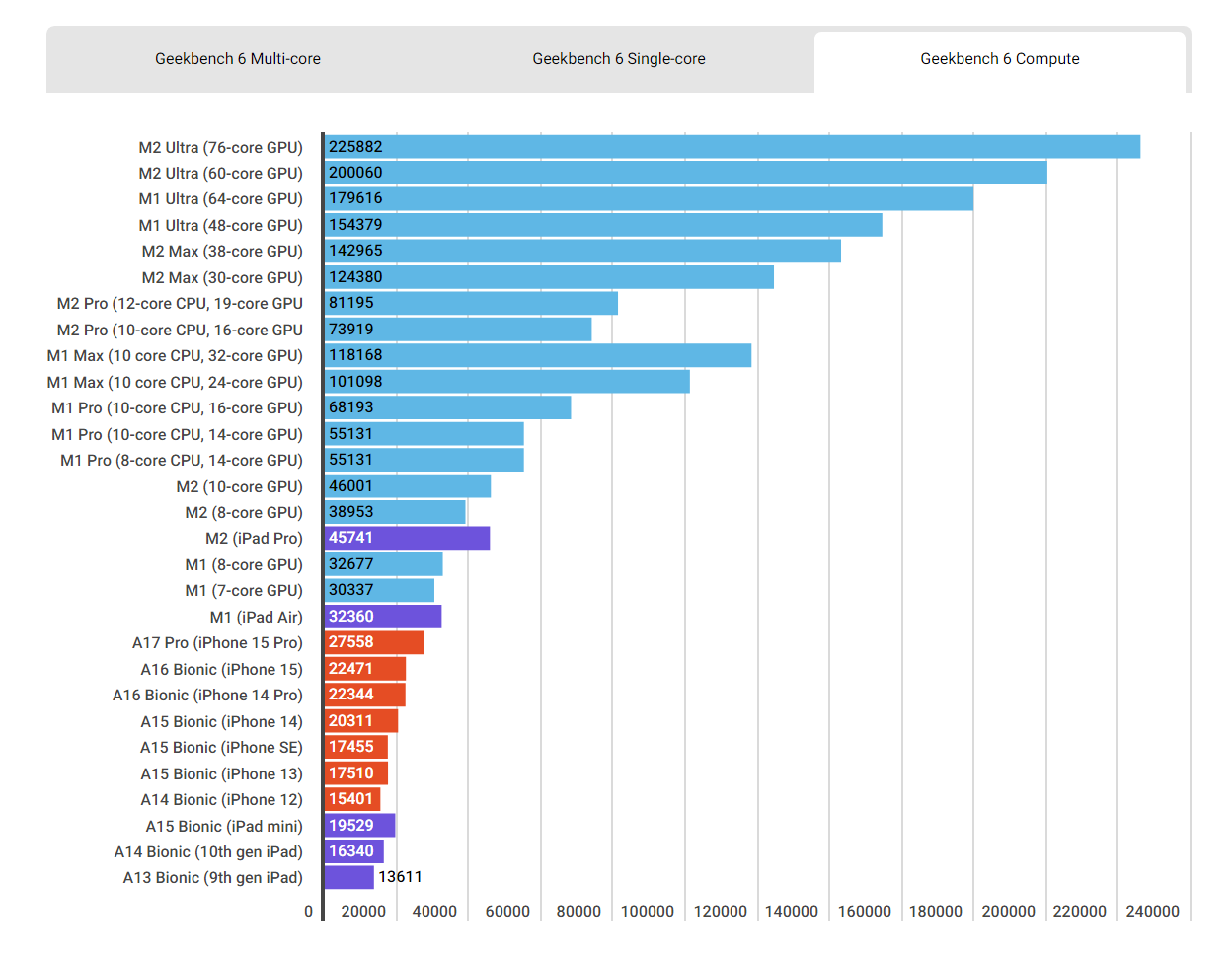 苹果旗下芯片性能统计:iPhone 15 Pro 机型可媲美入门级 MacBook Air