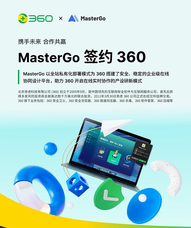 日前,MasterGo 签约360,以全站私有化部署模式为360搭建了安全、稳定的企业级在线协同设计平台,助力360开启在线实时协作的产设研新模式。据悉,北京奇虎科技有限公司(360)创立于2005年9月,是中国领先的互联网安全软件与互联网服务公司,曾先后获得多家风险投资商总额高达数千万美元的联合投资。2011年3月30日奇虎 360公司正式在纽交所挂牌交易。360旗下业务包括:360 安全卫士、360 安全浏览器、360 极速浏览器、360 杀毒、360 软件管家、360 压缩等。