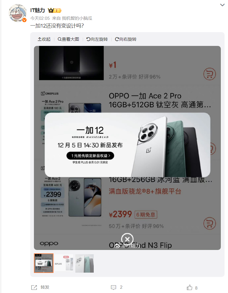 消息称一加 12 手机 12 月 5 日发布,外观曝光