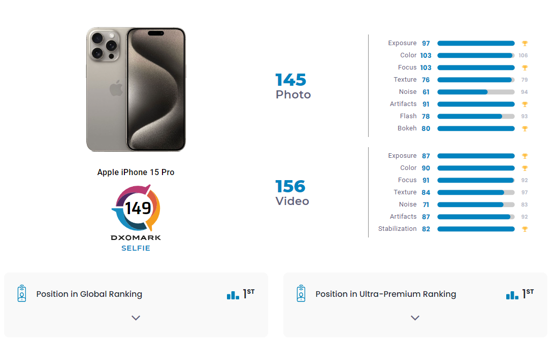 苹果 iPhone 15 Pro DXOMARK 前摄测试结果出炉:总分 149,位列排行榜第 1 名