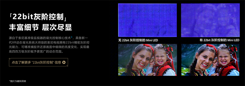 上影院看大片的乐趣之一,就是享受紧张刺激的大场景,枪弹的火花迸射,夜晚的激烈追逐,玻璃的璀璨碎片,无数的光影细节组合成了沉浸刺激的感官体验。要在家中也能还原电影感光影,对画面灰阶的精准控制十分重要,越精密的灰阶控制,就能带来越细腻的光影细节。索尼电视9系搭载的XR芯片,可以利用AI侦测与AI交叉分析,识别画面中的亮部,暗部以及明暗过渡层次,瞬间匹配最适合的算法给到微型Mini LED驱动芯片,通过超精准亮度等级控制,实现22bit灰阶控制。这项来源于基准级监视器的背光控制技术,可精准捕捉并还原画面中细微的亮度变化,实现最高四百万级灰阶赋予更宽广的动态范围,带来丰富的亮度层次与清晰的暗部细节,让消费者在家中也能体验影院级光影,把最原汁原味的电影带回家!