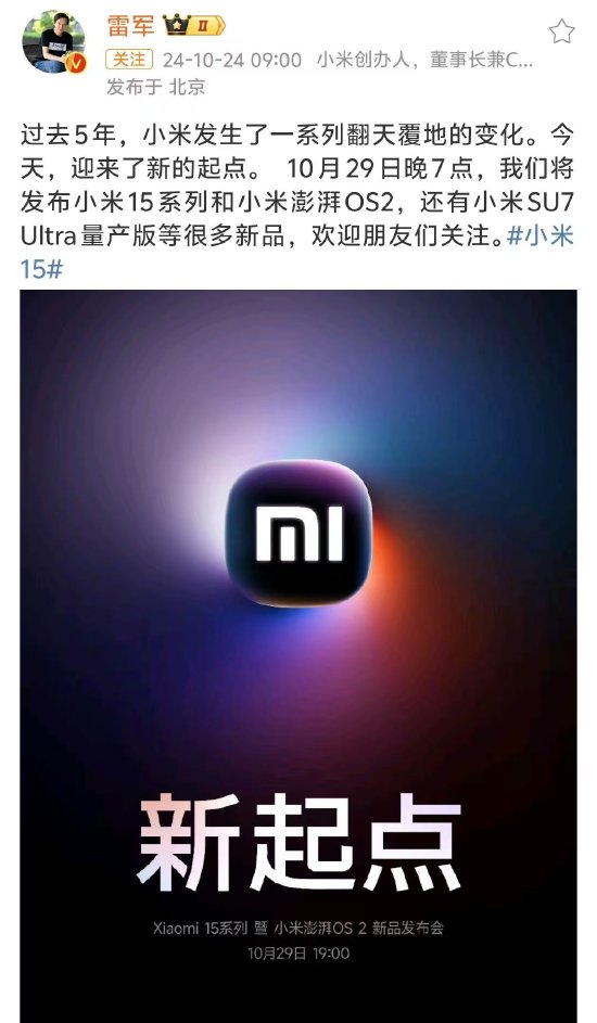 10月24日上午消息,雷军发布消息表示,小米将在10月29日晚7点发布小米15系列和小米澎湃OS2,并表示将带来小米SU7 Ultra 量产版等新品。