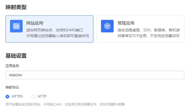 随后,根据提示填写应用名称、映射协议类型,WebDAV服务器局域网IP、端口等信息。