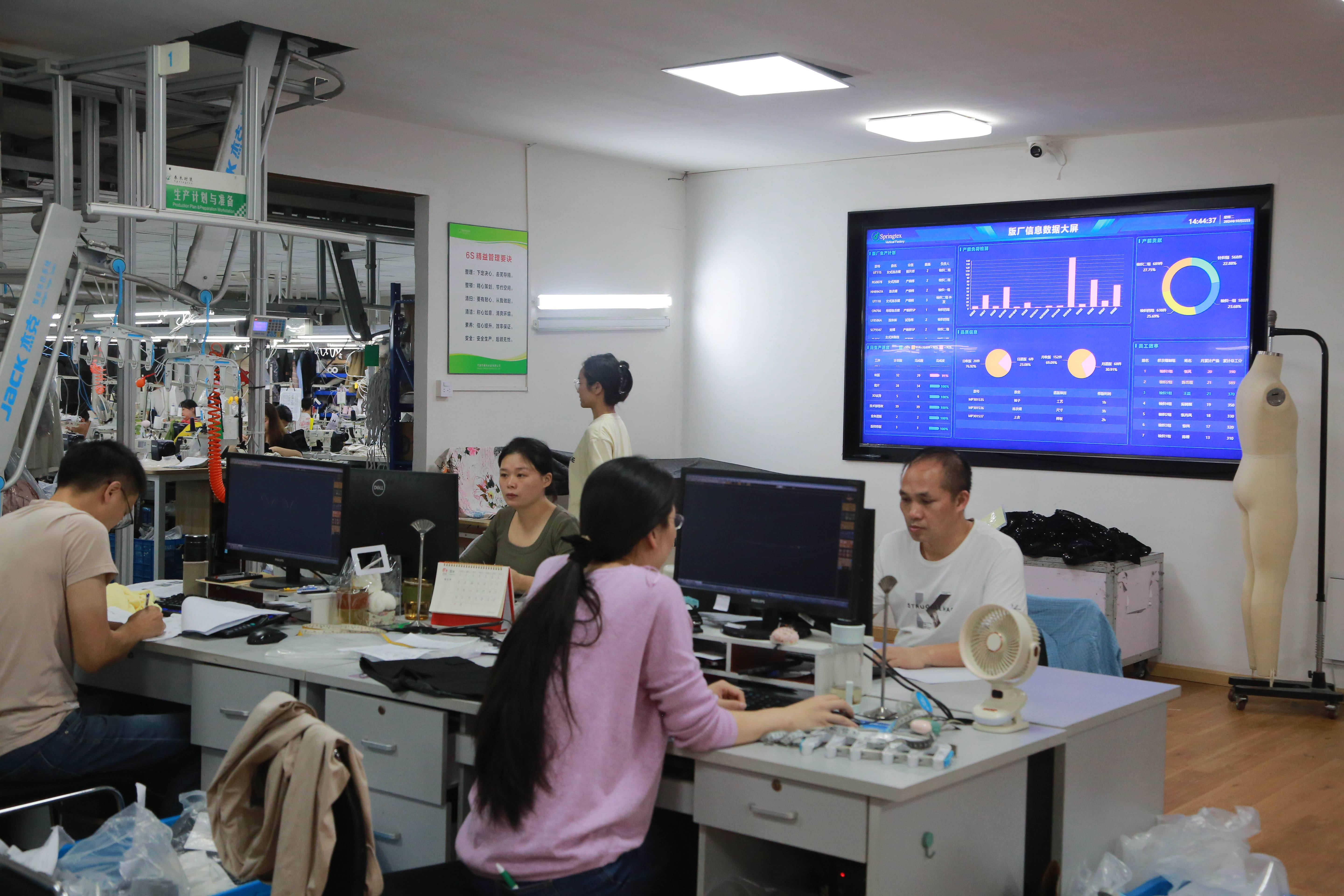 与此同时,在企业大数据指挥中心,工厂的管理人员正认真查看着覆盖内部订单、物料、车间、版厂、排单、报价管理、成本管理、人才管理等各生产流程的各种数据信息。2023年以来,春禾时装公司借助宁波1+1+N+X(即1个工业操作系统底座,1个行业工业互联网平台,N个共性需求,X个个性需求)数字化改造实现了整个数字链的贯通,系统分别对内部订单、物料、车间、版厂、排单、报价、成本、数码印花厂以及海外CRM等各个细致板块进行管理,还涵盖外部供应商、物料询价和采购系统等泛微系统,大大提升了生产、研发、供应链管理和渠道运营的效率。