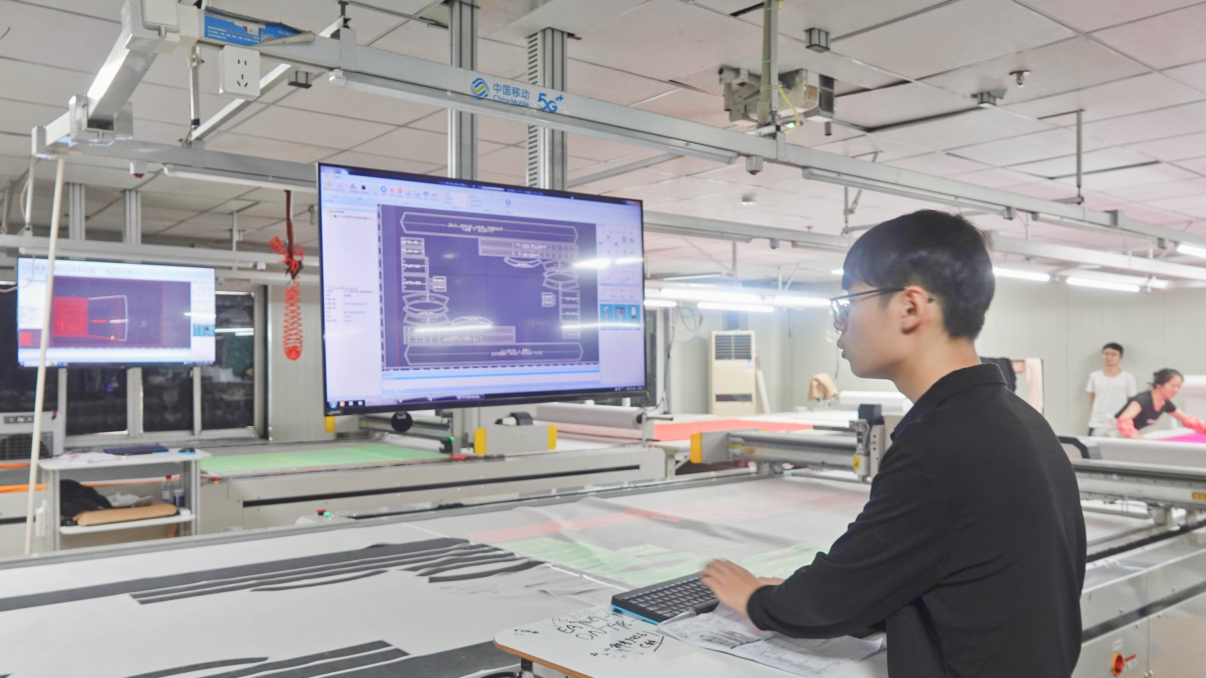 走进春禾时装有限公司的制衣工厂可以看到,从厂房的五楼到一楼车间,分别自上而下分布着从设计、打版、裁剪、缝制到成衣制成、熨烫、包装、出库等各个生产环节,而一套被称为“空中走廊”的智能吊挂系统,串联起服装生产的上百道工序,自动化的生产场景每天在这里上演。