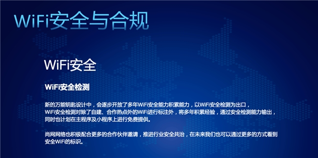 在隐私合规和个人信息保护方面,WiFi万能钥匙积极响应监管要求,主动开展合规风险识别和隐患排查,并探索能力输出,助力行业规范发展。“在新版万能钥匙设计中,我们会逐步开放积累多年的WiFi安全能力,将其通过安全检测能力输出并开放,可以支持用户对热点的风险进行识别。”张作裕表示,尚网网络将积极配合合作伙伴的邀请,推进行业安全共治。