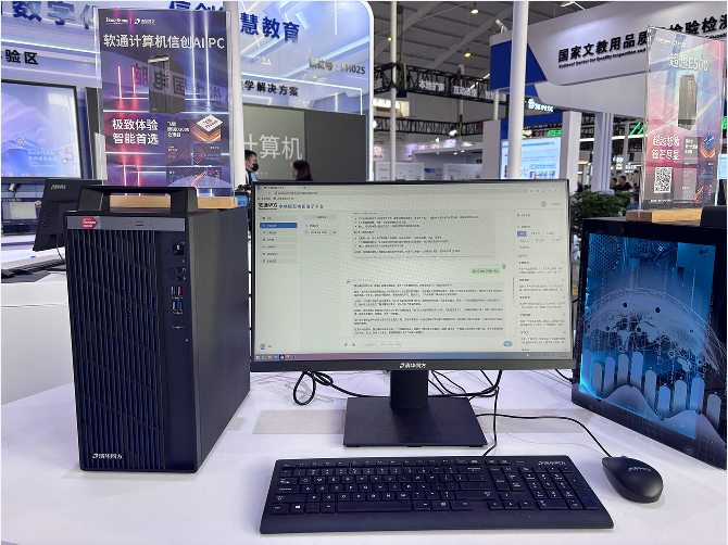 作为本届展会亮点,飞腾携手软通计算推出的最新AI PC搭载全新一代飞腾腾锐D3000 CPU,以及海飞科GPU,为用户提供更高效的算力保障,配置灵活,安全可靠。通过本地化部署AI大模型,结合教学场景中的不同需求,为师生打造了前所未有的个性化学习路径,极大增强了教学互动性,提高教学效率,让学习变得更加简单高效。