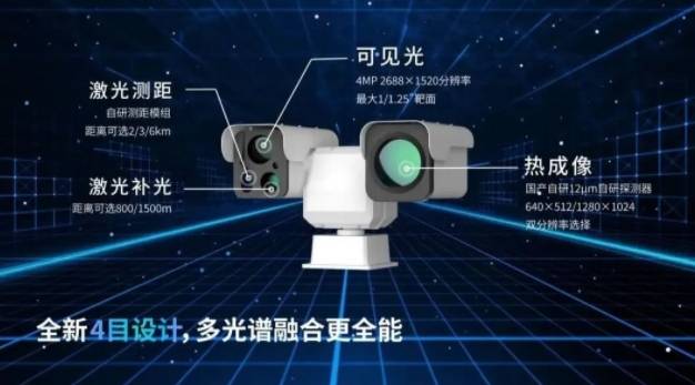 多光谱成像,热成像支持32万像素(640×512),可见光分辨率高达400万像素(2688×1520),激光补光距离最远1.5km,激光测距距离最远6km