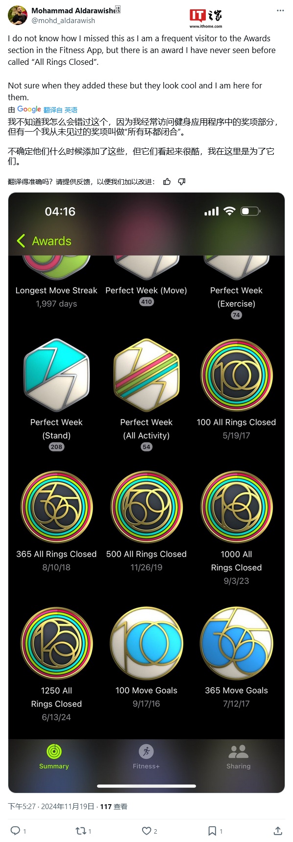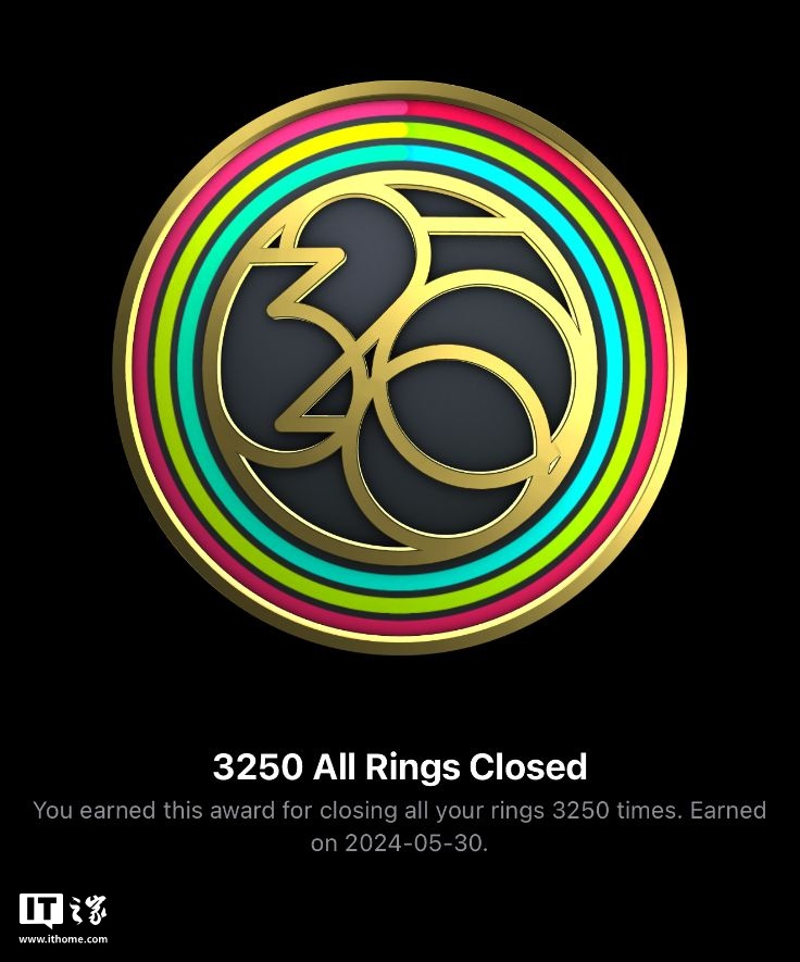 苹果 iOS 18.2 为 Apple Watch 新增“全闭环”成就:铁粉解锁 3250 天