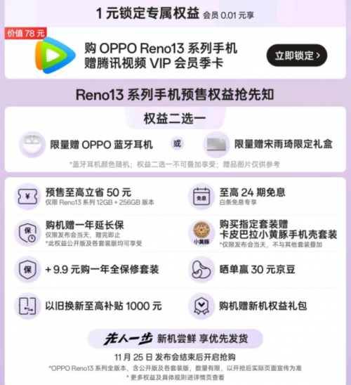 在京东APP搜索“OPPO先人一步”可0元预约赢新机,还能花1元提前锁定腾讯视频VIP会员季卡(会员仅需0.01元)。此外,参与OPPO Reno13系列预售还可享限量赠OPPO蓝牙耳机或限量赠宋雨琦限定礼盒、至高立省50元、至高24期免息、限时限量赠一年延保、以旧换新至高补贴1000元、加9.9元购一年全保修套装、限时购指定套装赠卡皮巴拉小黄豚手机壳套装、晒单赢30元京豆、赠新机权益礼包等福利。