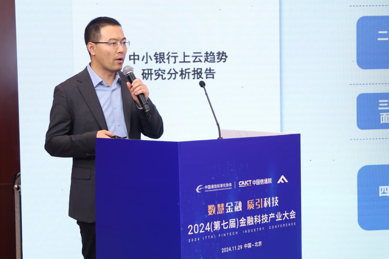 11月29日,由中国通信标准化协会主办,中国信息通信研究院(以下简称“中国信通院”)承办的2024(第七届)金融科技产业大会于北京如期举行。在下午的“金融信创技术与应用主题论坛”上,华为云与中国信通院云计算与大数据研究所联合编制的《中小银行上云趋势研究分析报告》(以下简称“报告”)正式发布。报告结合金融机构数字化建设需求和现状,基于金融行业的多年创新实践打造,旨在更加深入地分析中小银行差异化的业务发展现状和上云需求,加速中小银行的上云进程,助力产业发展。