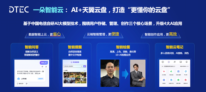 今年517电信日,天翼云盘率先发布了AI智能助手,包含智能搜图、智能绘图、智能云笔记和智能问答四大智能工具。智能搜图基于多模态大模型,实现以文搜图、以图搜图,于海量数据中快速精准查找照片;智能绘图基于视觉大模型,实现了模糊照片高清化、黑白照片智能上色;智能云笔记基于语音识别技术,实现课堂讲座、会议发言的语音转文字及智能总结提炼;智能问答基于语义AI大模型,能够理解自然语义,提供全能小百科、文案轻松写等对话式智能助理功能。