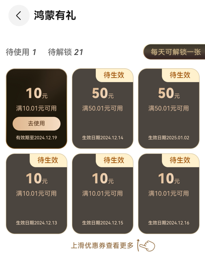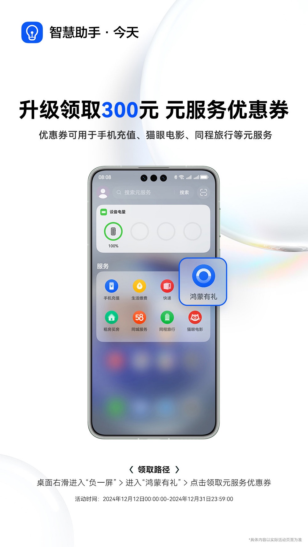 这次华为给到的元服务优惠券包总价值300元,包含两张满50.01元减50元券和二十张满10.01元减10元券。大家只要在12月31日前升级到原生鸿蒙系统,并在华为钱包中绑定一张银行卡,即可一次性全部领取,领取后分批陆续生效。这些优惠券可以在各类元服务中使用,不光能给手机充值或缴纳水、电、燃气等生活费用,在猫眼电影、同程旅行、奈雪点单、捷停车、E高速、网上国网、优惠加油等元服务中下单支付时也能立享优惠!马上要跨年了,跟朋友一起旅行或聚会时,这些元服务优惠券都能帮你省下一笔~