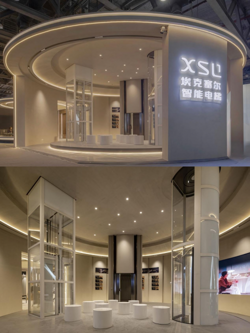 此次埃克塞尔与梁志天先生的跨界携手,不仅是梁志天先生首次与电梯品牌联名,更彰显了埃克塞尔智能科技集团对美学设计的深厚造诣与不懈追求。“未来·家”展厅以其前卫的设计吸引了众多目光,李蔚然女士解读了展厅的设计理念——展厅外观简洁,以圆形建筑融 合灯光细节,衬合简洁弧形立面展现未来建筑感;展厅内部,米色调 材质与肌理漆面交织,营造纯粹而温馨的空间,两部观光梯对称排列,透光的管道与米白色圆形展厅交织,与埃克塞尔的外呼旋钮LOB X-01在概念上形成了完美的契合。