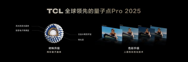 在材料方面,量子点Pro 2025进行了全面升级。由四元量子晶体升级为绚彩量子晶体,使用复合纳米金刚结构,并采用多层共挤技术和高精密混合技术制成量子点层,大幅提升发光效率。同时,TCL采用人因色彩优化技术,通过智能识别画面色彩,根据画面不同颜色采用动态色彩管理,进行多维渲染,让量子点的色彩显示更符合人眼对世界的感知。