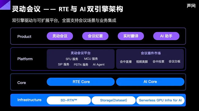 RTE 技术确保了低延迟、高质量的音视频传输,让视频会议沟通更加实时流畅;而生成式 AI 则通过对会议内容的分析和生成,提供智能化的辅助功能,如实时字幕、AI 会议纪要等。两大技术支撑,让会议从传统的信息传输工具升级为智能协作平台,有效提升了会议效率和用户体验。