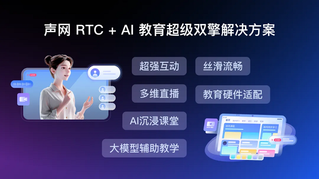 教育领域,声网 RTC+AI 教育超级双擎解决方案,通过 RTC+AI 双引擎驱动在线课堂教学体验的升级以及教学场景的创新,该方案包含了超强互动、丝滑流畅、多维直播、教育硬件适配、AI沉浸课堂、大模型辅助教学等六大特性。可应用于直播大班课、智慧教室、学习机、AI口语老师等在线教育场景。支持大模型辅助教学,运用大模型构建 AI 口语老师场景,学生可通过实时语音与 AI 进行问答互动,从学生发言到 AI 对话响应延时可做到低于500ms。