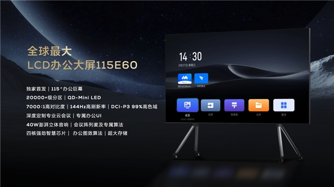 最后,TCL隆重推出115”全球最大LCD办公大屏115E60,这款大屏基于QD-Mini LED技术,能够提供极致的画质体验,为企业会议、培训、展示等多种场景,提供“更大”的解决方案,助力企业塑造高端大气的企业形象。