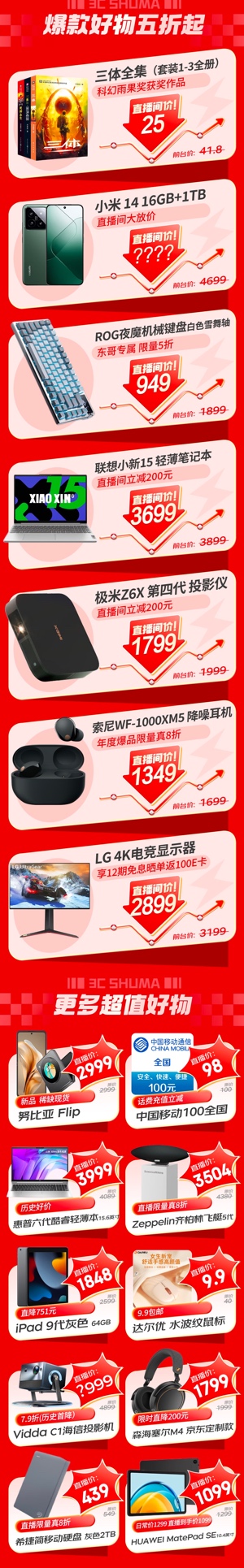 本场直播中,“采销东哥AI数字人”将为大家带来性能与颜值兼具的小米14手机、办公学习神器联想小新15英特尔13代标压i5超能笔记本、三体全集书籍、ROG夜魔机械键盘、索尼WF-1000XM5真无线蓝牙降噪耳机、LG 4K电竞显示器、极米Z6X第四代投影仪等众多数码爆款,限时限量好价开抢。