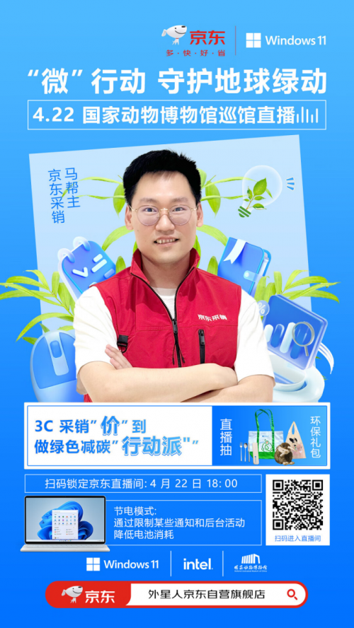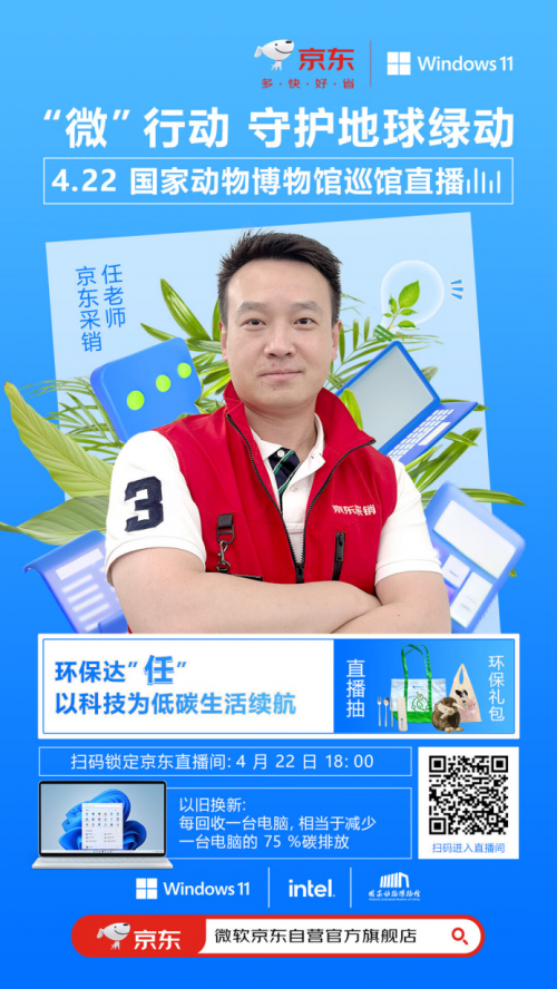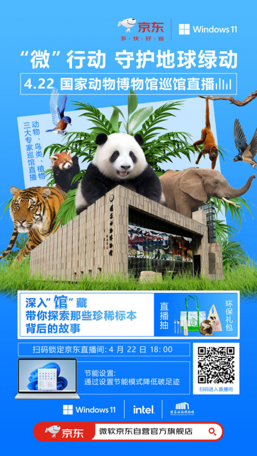 4月22日迎来第55个世界地球日,活动当天,京东3C数码携手微软与Intel及众多品牌,与国家动物博物馆联合发起“‘微’行动守护地球绿动”倡议,并于当日下午18:00在京东装机大师直播间开启国家动物博物馆巡馆直播活动。除了邀请动物、鸟类、植物三大专家分享地环保理念与生态保护知识,京东3C数码采销还带来了华硕、联想、外星人、惠普、华为、小米、机械革命、微软等品牌热销的AI PC好物,更有Windows 11机型皆享以旧换新服务,让用户既得好物,又能拓展环保视野,提升环保意识。