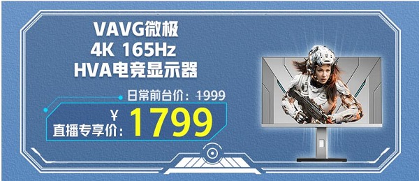 本场直播将重点展示5个知名显示器品牌的优秀产品。首先是来自VAVG微极的4K 165Hz HVA电竞显示器,是目前为止全网首个HVA面板的4K/165Hz快速液晶屏。这款显示器的每处细节都是精细打磨,手感舒适也耐看,无论是玩PS5游戏、电脑主机3A游戏,还是看杜比视界电影,暗处的画面细节都表现得很出色,2千元以下同规格的产品中,画质细节表现出色,日常价1999元,京东采销直播间专享价为1799元。