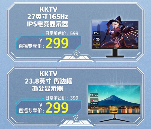 KKTV 23.8英寸微边框办公显示屏,23.8 英寸的屏幕不大不小刚刚好,超薄机身和超窄边框占桌面空间极少,1920*1080P分辨率和75Hz刷新率带来舒适的视觉体验,无论是办公还是娱乐都合适,日常价399元,京东采销直播间专享价为299元。更有KKTV 27英寸165Hz IPS电竞显示屏,日常价599元,京东采销直播间给出了更低的价格力度,直播专享价只要299元就能入手,是京东携手厂商专门给用户送出的福利。