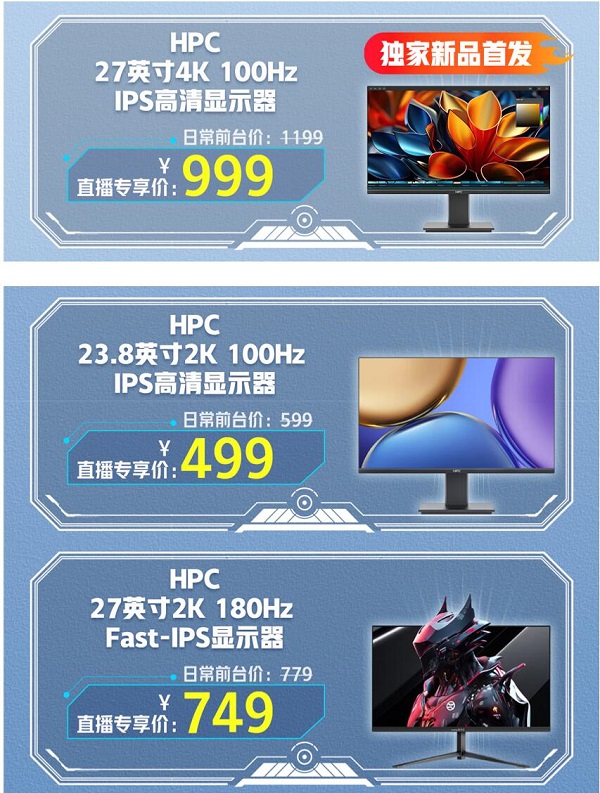 作为高性价比的优秀显示器品牌,HPC的23.8英寸2K 100Hz IPS高清显示屏,只需花费1080P分辨率显示器的价格,就能入手2K高清的HPC办公显示器,不仅显示色彩优秀,还有高达100Hz的刷新率,浏览网页操作丝滑,桌面空间占比也小,适合家用或是办公入门使用,日常价599元,京东直播间专享价为499元。此外,HPC还有27英寸4K 100Hz、27英寸2K 180Hz等配置的显示屏,在采销直播间均可享受更低专享价。
