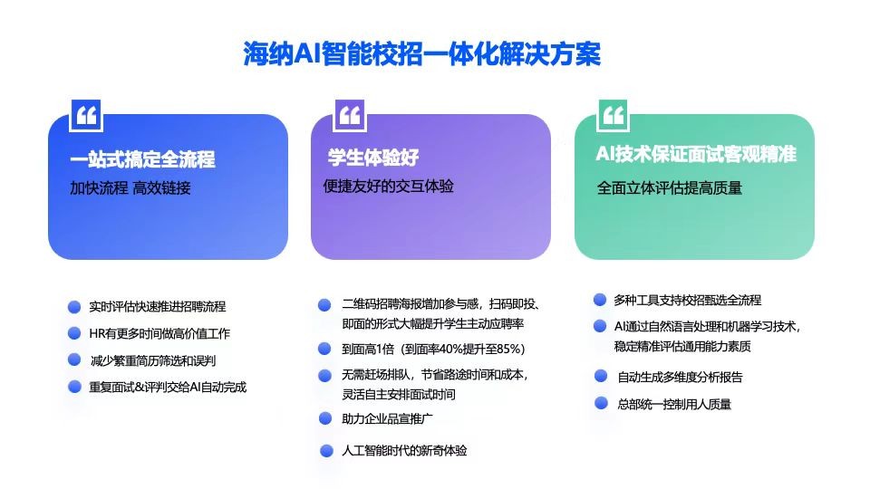 结合AI技术与人才测评科学的海纳AI智能校招一体化解决方案,一站式搞定校招全流程,提升学生应聘体验,同时AI技术保证面试官客观精准,助力企业快速高效招募校招人才。