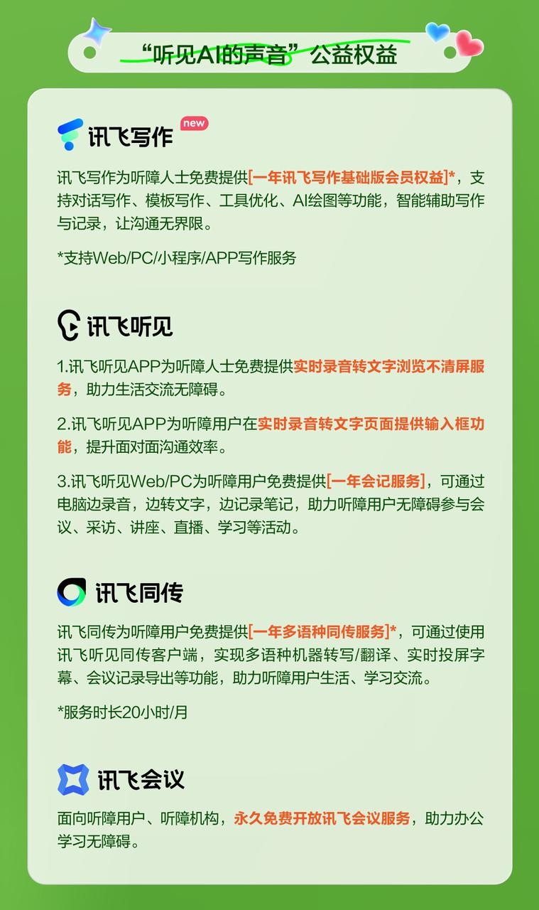 今年,“听见AI的声音”为听障群体带来了更多的免费产品权益,包含讯飞写作、讯飞听见APP、讯飞听见会记、讯飞同传、讯飞会议等诸多免费使用时长及转写权益等,变听为看、看听结合,建立起听障群体与社会沟通的桥梁,让他们更好地“听见”世界,同时也被这个世界“听见”。