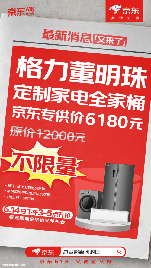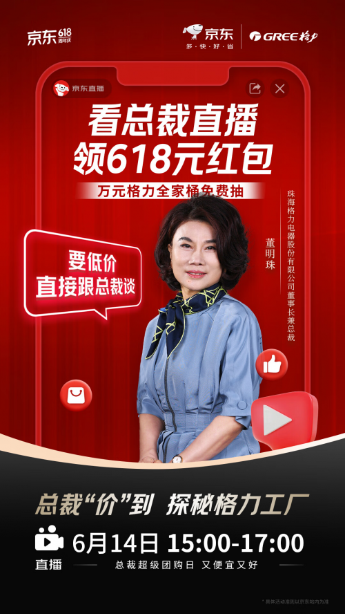 今年京东618期间,为满足消费者换新家的需求,京东联合国内外家电家居品牌带来了丰富的商品、实惠的价格、省心的服务。据悉,6月14日15点格力电器董事长兼总裁董明珠将空降格力京东自营官方旗舰店直播间,除了带来物美价优的尖货爆品,还会有狂撒40万红包雨、抽10套格力董明珠定制全家桶等重磅惊喜福利,让消费者与总裁直接面对面,真切享受“没有中间商赚差价”,总裁直接降价的专属体验。值得一提的是,6月14日直播过程中,董明珠还将带大家探访格力工厂,向各位消费者讲解格力的冰洗系列产品,届时还会揭秘她自己冰箱里的“好物”,大家还能见证格力洗衣机现场洗蜀锦的全过程。