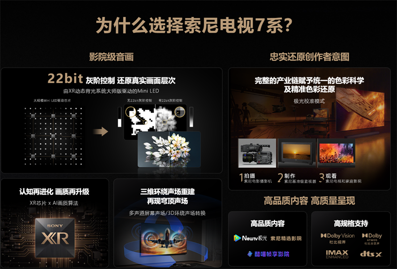 索尼拥有从镜头到客厅的全产业链优势和全线产品统一的色彩科学,可以忠实还原电影创作者意图的画面,最懂如何向消费者呈现一部高品质的电影。索尼电视7系不但支持多平台,高码率,高帧率的高品质内容,还拥有独享的“索尼精选影院”,能提供精选4K超高清电影内容,结合高品质解码及画质优化技术,给消费者私享级高品质内容享受。无论是专业观众还是电影爱好者,索尼电视7系都能高质量地还原高品质电影的原貌,让每部电影都能成为一场感官的沉浸之旅。