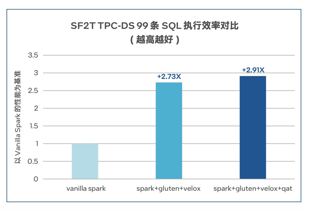 东方国信适用于超大规模数据存储和在线分析的大数据 BEH平台企业版通过集成Gluten与Velox Backend向量化执行引擎,为Spark注入了原生矢量化执行的能力,同时结合第四代英特尔® 至强® 可扩展处理器,以及处理器集成的英特尔® QAT加速器,显著优化了Spark批处理计算、SparkSQL计算、SQL查询服务的执行效率。经测试,在相同硬件环境下,配合英特尔® QAT的加成,Spark计算性能可提升高达 2.9倍。