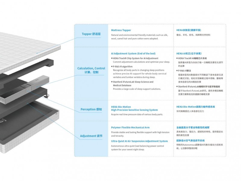 这需要强大的技术团队支撑。依然以HEKA AI床垫为例,其研发团队由来自斯坦福大学睡眠科学与医学中心、北京大学、硅谷iFutureLab 等国际科研机构的专家组成。HEKA方面的公开信息显示,HEKA已先后完成了睡眠科技的关键技术布局,其中包括生物反馈系统设计、医疗传感芯片系统设计、高精力敏传感设计、智能硬件研发制造、公布式大数据加密系统、云计算、睡眠医疗健康大数据挖掘及平台建设等。基于关键技术布局,才让HEKA AI床垫能够在无需操控的情况下,自动识别、适应用户的体型和睡姿,并自动调节床面的高度和软硬度,提供精准的支撑。