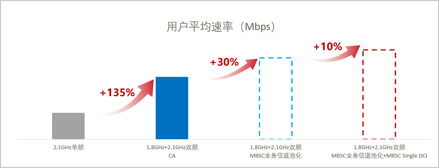 现场测试显示,1.8GHz+2.1GHz双频大带宽NR CA,与2.1GHz单载波40MHz相比,下行速率显著提升了135%。随着支持NR CA的终端在现网中的比例增加,MBSC业务信道资源池化功能激活后,预计下行速率将进一步提升30%。此外,随着R18终端逐步引入对MBSC Single DCI的支持,随着R18终端比例的增加,下行速率将再次提升10%。