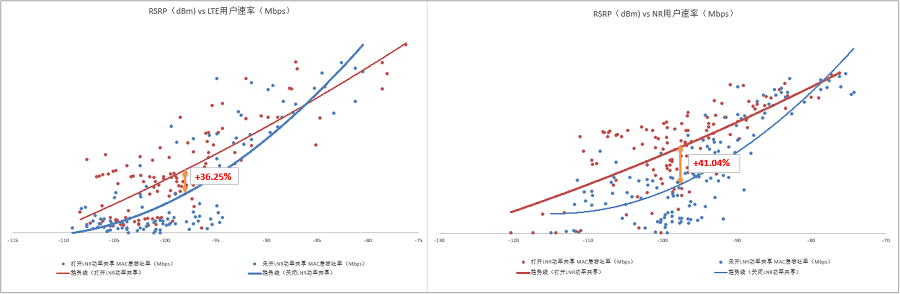 从用户体验看,LNR跨制式功率共享开启后,LTE侧拉远平均增益18.5%,NR侧拉远平均增益21%。在距离基站较远时(大于1.2km),LTE侧增益可达36.2%,NR侧增益可达41%。