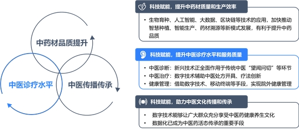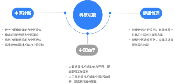 2)科技赋能诊断、治疗、健康管理等环节,推动中医诊疗水平和服务质量提升。数字技术和智能设备辅助中医诊断、处方开具、疗法创新以及健康管理,能够兼顾整体状态调节和精准靶向治疗,有利于为民众提供更加优质的中医服务。