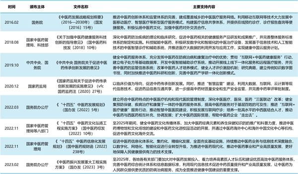 作为中国古代科学的瑰宝、中华文化“出海”的载体,中医药受到政府的持续支持。党的十八大以来,党中央、国务院把中医药工作摆在更加突出的位置,从首次印发《中医药发展战略规划纲要(2016—2030年)》(国发〔2016〕15号),首次发布《中国的中医药》白皮书,再到《“十四五”中医药发展规划》(国办发〔2022〕5号)、《“十四五”中医药信息化发展规划》(国中医药规财函〔2022〕238号)等系列文件提出,“国粹”发展有了“国法”保障,中医药发展上升为国家战略,为建设高水平中医药传承保护与科技创新体系,推进中医药现代化、产业化、数字化、智能化,推动中医药高质量发展和走向世界指明了方向和发展目标。