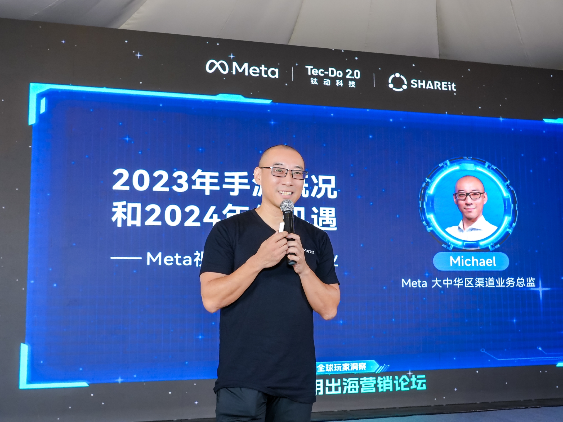 Meta大中华区渠道业务总监Michael为论坛做开场分享,带来以《2023年手游概况和2024年的机遇——Meta视角下的游戏行业》为主题的演讲。他提到,根据Meta的广告花费推测,美国仍然是迄今为止最大的市场,同比增长率约增加3%,日本和印度在2023年同比增长率最高,韩国则是另一个高速增长的市场,同比增长19%。
