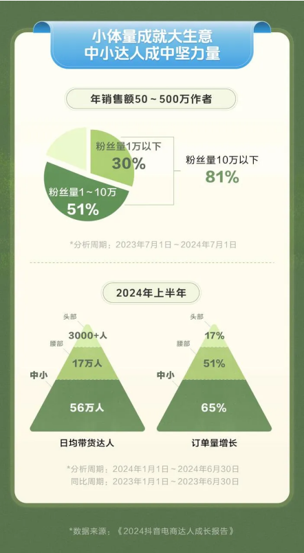 当天,抖音电商发布《2024抖音电商达人成长报告》,披露近一年带货达人经营数据。数据显示,小体量也能成就大生意,年销售额50万至500万的作者中,粉丝量1万以下的达人占比 30%,粉丝量1至10万的占比 51%;2024年上半年,抖音电商中小、腰部、头部日均带货人数分别超过56万、17万、3000。