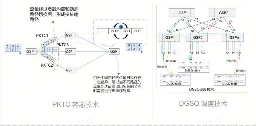 GSE 网络基于 PKTC 容器技术,实现了高精度的网络负载均衡,从根本上改善了传统 AI 算力网络链路的带宽利用率;采用基于 DQSQ 的信令申请调度技术,数据流以“Pull”的方式进行转发,突破了传统以太网的性能瓶颈,网络性能提升至 95%以上。