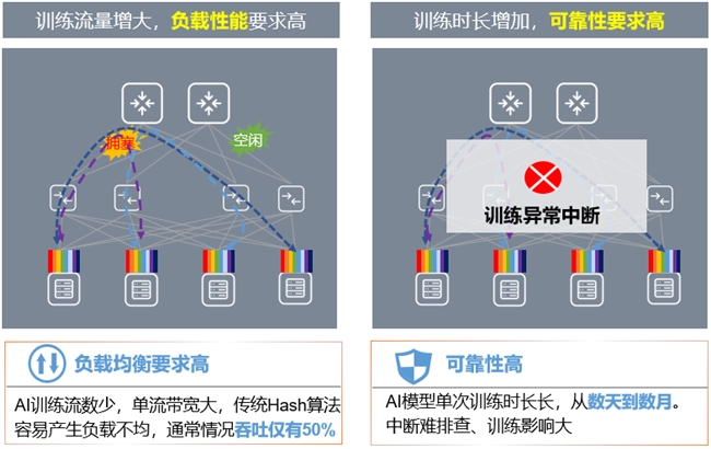 在基础训练模型中,一方面多任务混合部署,传统以太网源端发流直接采用网络“Push”流量模式,不考虑网络及接收端的接受能力,导致网络拥塞,使得 GPU 处于等待状态,造成梯度和参数同步过程中算力资源浪费较大,传统的 RoCE 网络有效吞吐仅为 50%;另一方面,智算集群网络流量呈现出数据流数目少、单流流量大的特点,在传统网络均衡算法下容易引发HASH 冲突,造成链路丢包,导致训练异常中断,极大影响训练效率。时代呼唤 “零丢包”、“高吞吐”、“低时延” 为核心特征的无损智算网络设备,来解决超大规模 AI 计算通信效率低的问题。