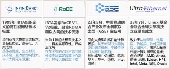 新技术流派2:GSE(Global Scheduling Ethernet)网络,中国智算中心的建设热潮始于 2020 年,目前已有 40 多个城市在建设或在建智算中心。智算中心建设步伐加快,但国内的网络技术发展却滞后于 AI 大模型的演进。 AI 网络技术上的竞争已经成为中美技术博弈的新战场。在这样严峻的形势下,2023 年 5 月,中国移动联合产业界发布了全调度以太网(GSE)白皮书,同年8 月全调度以太网推进计划正式开启,标志着具有中国自主技术的 GSE 流派正式诞生。