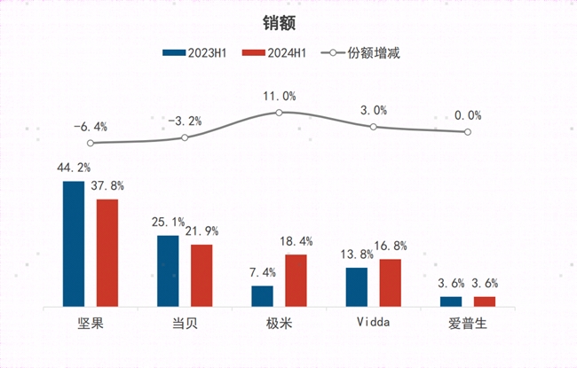 好在另一方面中高端市场也有显著增长,让智能投影行业的可持续发展有所支撑。4K超高清、三色激光等技术的组合,代表着高端高画质智能投影消费的趋势,而分别高达61%和51%的增长率也给行业带来持续信心。此外,根据洛图科技线上监测数据,2024年上半年,Vidda、极米、坚果、爱普生等排名前五品牌在激光投影市场的合计销量和销额均超过98%,而其中三色激光的占比高达71.6%。