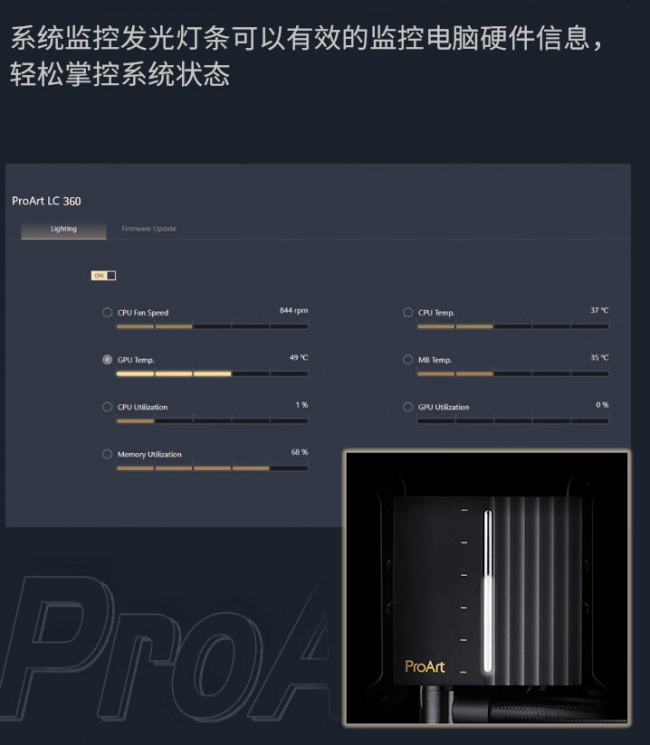 华硕创艺国度 ProArt LC360一体式水冷散热器,在极致性能的不懈追求中,更以匠心独运的简约设计引领潮流。其铝制波浪形外罩,精妙融合美学与效能,不仅显著提升视觉美感,更通过流线型设计强化了散热效率。该款水冷散热器还配备了独特的NCVM镀铝工艺灯条,赋予DIY用户前所未有的个性化体验,另外,其还与系统监控智能联动,让散热器的每一次运行都尽在掌握,运行状态一目了然。这一创新设计,不仅满足了用户彰显个性的强烈愿望,更为电脑主机披上了一层璀璨夺目的科技外衣,点亮每一个灵感迸发的瞬间。