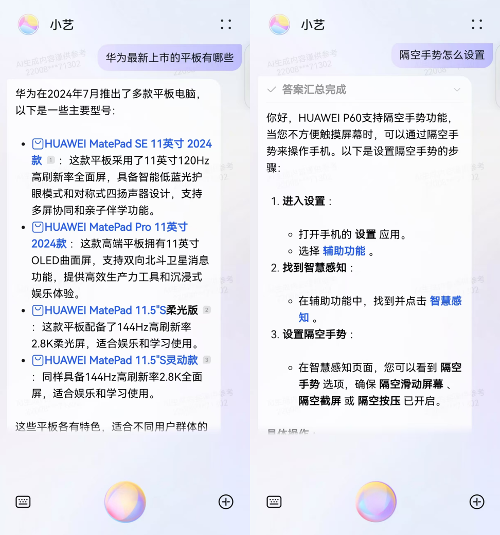 此外,小艺还能化身“华为产品专家”, 帮我们解锁更多智能生活体验,为我们讲解华为终端“1+8”设备产品的各种知识,提供从设备规格查询、设备对比到玩机技巧等一站式产品咨询服务。近期恰逢暑期大促,如果大家有手机、平板、手表、电脑等产品的换机需求,都可以唤起小艺询问相关信息。另外在产品使用过程中有任何疑惑,仍然可以问问小艺,像“隔空手势怎么设置”等问题,小艺都能立即给到全面专业的回答,教我们秒变科技达人。