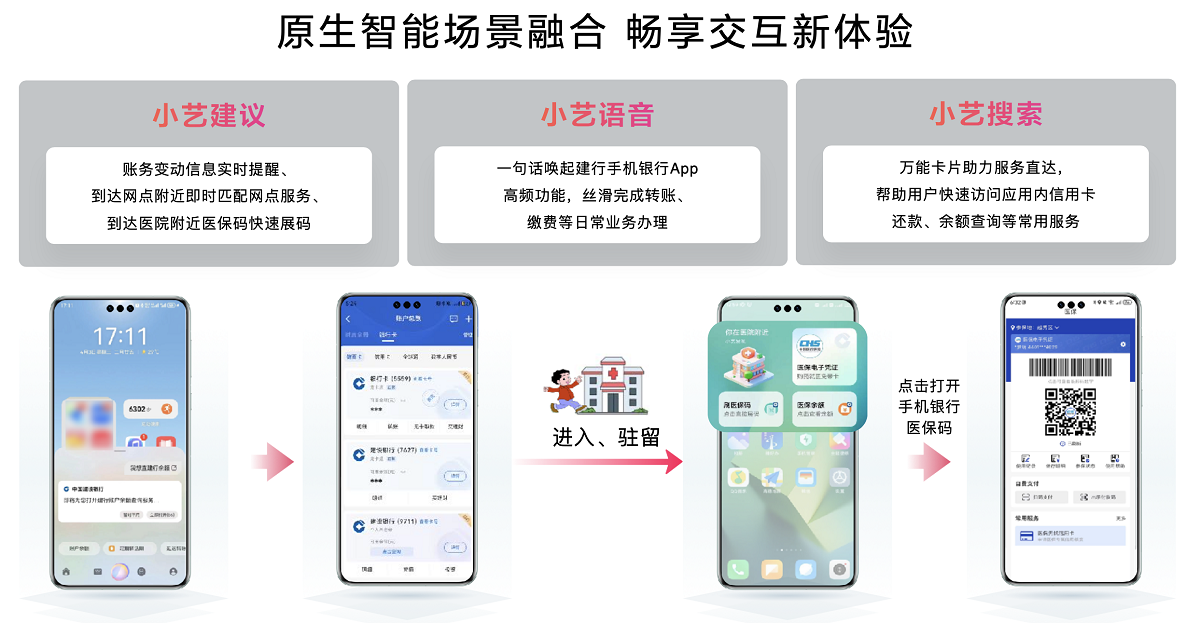 此外,当用户临近医院时,小艺建议会推荐银行应用中的医保电子凭证,并可适时推荐帐户变动提醒、理财产品到期提醒、信用卡还款提醒,帮助用户了解帐户和理财信息,减少忘记还款导致信用卡逾期的可能。用户还可通过搜索“转账”直达转账页面,搜索“付款码”直达付款码页面。